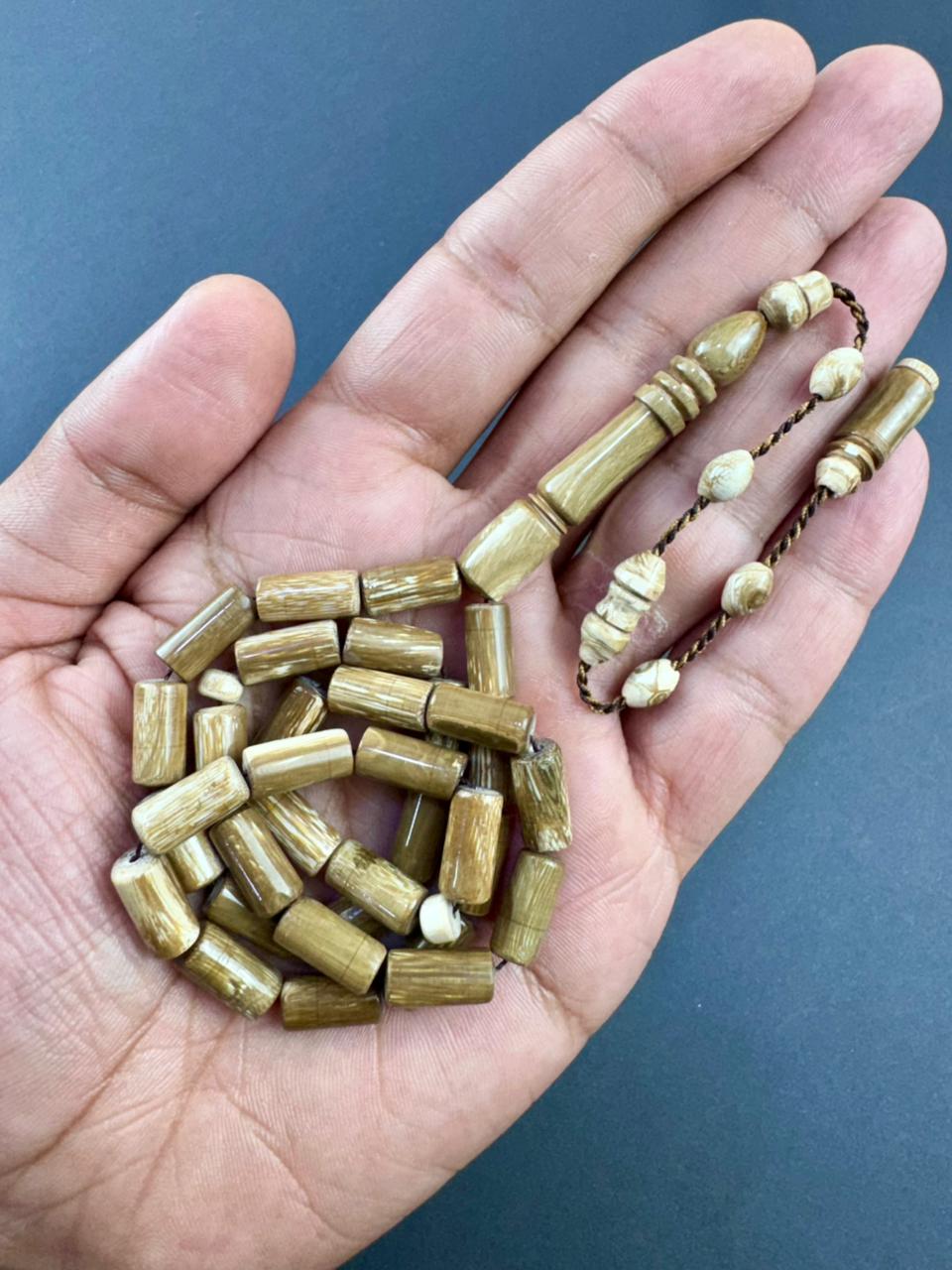 مسباح من ( اليسر الطبيعي ) المستخرج من البحر الاحمر بعدد 33 خرزة صنوبرية وزن 28 مقاس 6*13 ملي مزين بطقم تمليكة فاخر